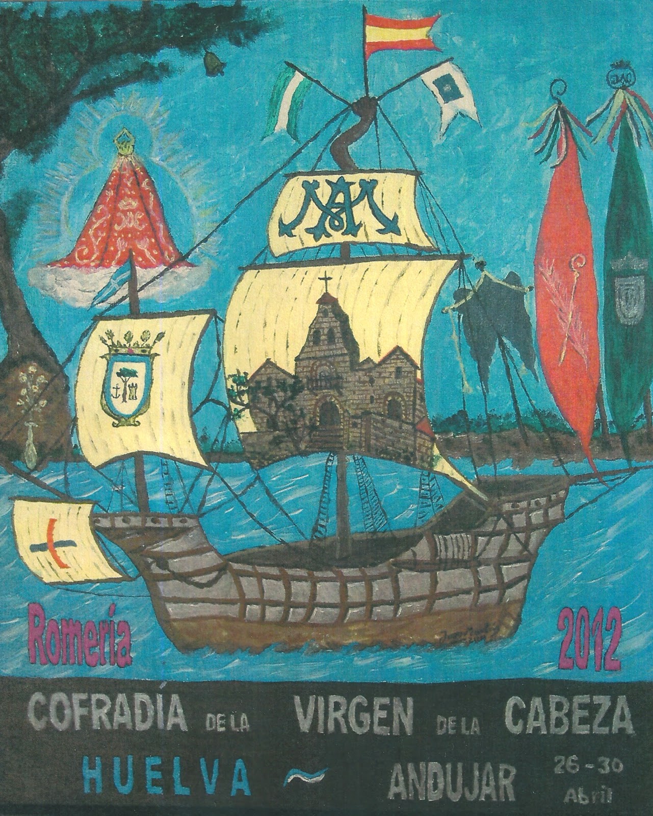 Como centro de la vida de Huelva, la carabela Santa María, la vela mayor el Santuario, en la de proa el Escudo de Huelva, en otras velas el símbolo Mariano y la Cruz Trinitaria. La campanilla que anunció su aparición en la noche del 11 al 12 de Agosto de 1227. La Rosa de Oro concedida a la Virgen de la Cabeza por el Santo Padre Benedicto XXVI. Bajo una encina nuestra Madre, mirando al infinito, para recibir, todas las plegarias de sus hijos, a lo largo y ancho del mundo.